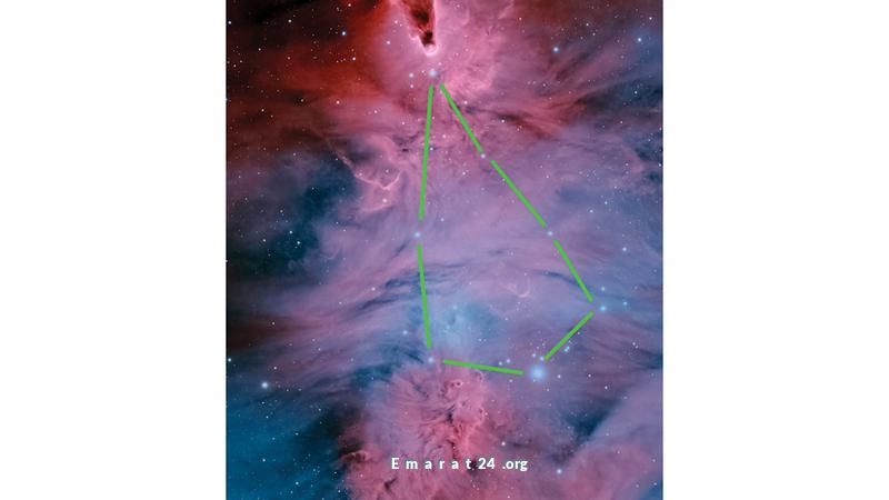 عنقود الشجرة بتجمعه النجمي يشبه شجرة، ويشتهر عالمياً بلقب عنقود شجرة عيد الميلاد. يعلوه سديم المخروط، وهو غازي غباري الشكل يضفي بعداً فلكياً على الصورة.