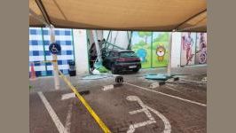 الاصطدام ببوابة موقف مركز تجاري والهروب من الموقع